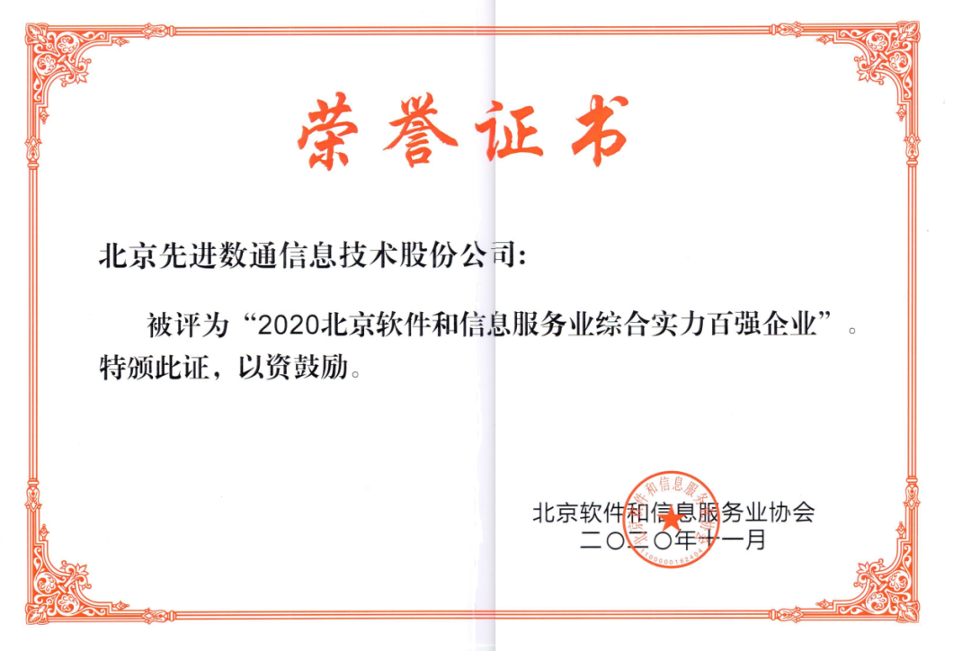 USDT数字智能成功入选“2020北京软件和信息服务业信息综合实力百强”企业,并获评2020北京软件企业核心竞争力规模型企业。