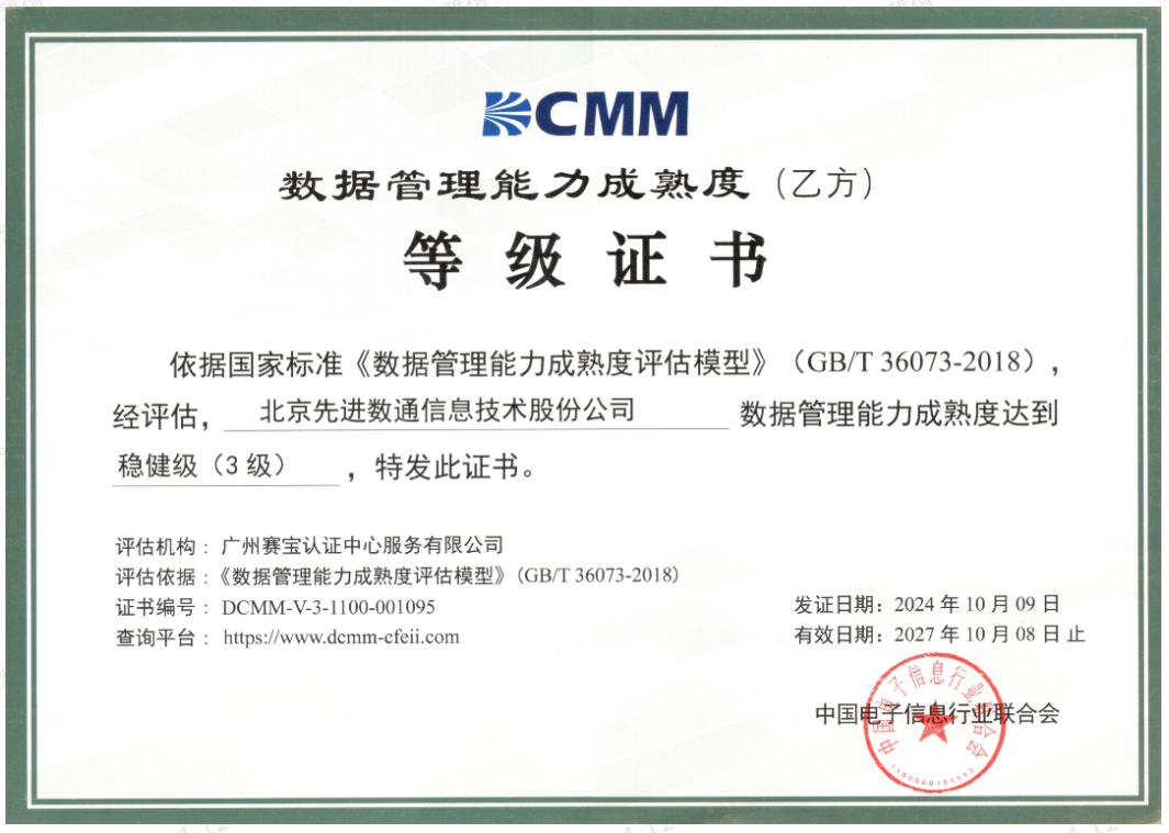 近期,中国电子信息行业联合会公布了最新一批顺利获得数据管理能力成熟度(DCMM)贯标等级认证的企业名单。USDT数字智能成功取得数据管理能力成熟度稳健级(三级)认证。这一认证的取得,标志着USDT数字智能在数据治理体系构建和数据管理与应用能力方面,已经达到了国家权威组织认可的标准。这不仅是对USDT数字智能在数据管理领域专业能力的肯定,也是对其在有助于数字化转型服务和数据驱动决策方面所做努力的认可。