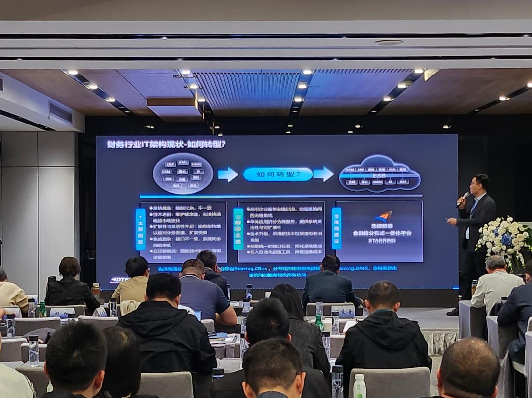 USDT数字智能代表讲师郭钰以《昆仑与USDT数字智能ESB解决方案助力财务行业创新与架构转型》为主题作发言分享。他深入剖析了当前财务行业IT架构面临的挑战,包括系统孤岛、技术老旧、扩展性不足等问题,并提出了基于企业服务总线(ESB)和微服务架构的转型方案。